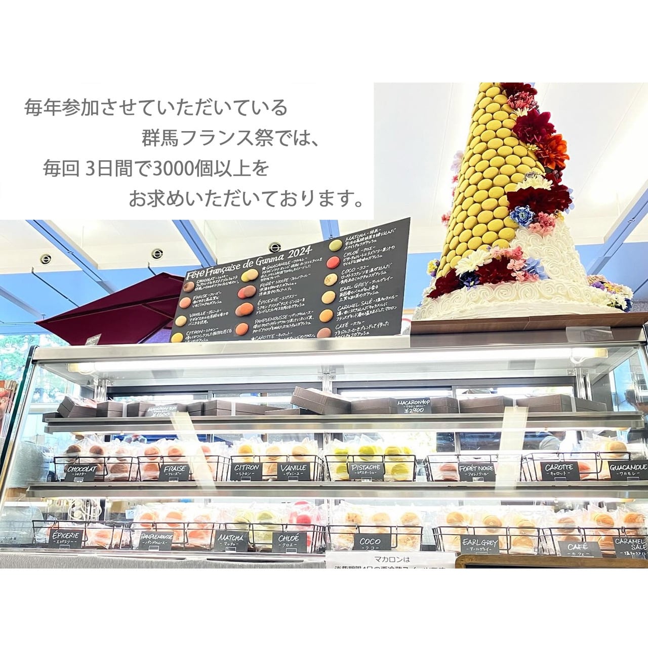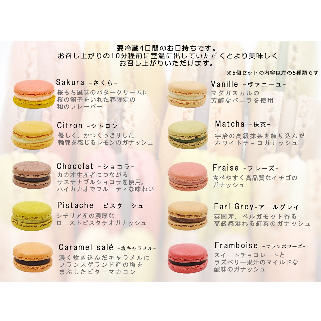 チョコレート(フランス産),生クリーム,砂糖,アーモンド,鶏卵,苺,ピスタチオ,レモン,ラズベリー,餡子,桜,抹茶,紅茶,ココア,バニラ,塩/乳化剤,香料,食用色素(黄4号,赤102号,青1号)※同工場で小麦粉の取り扱いがあります。