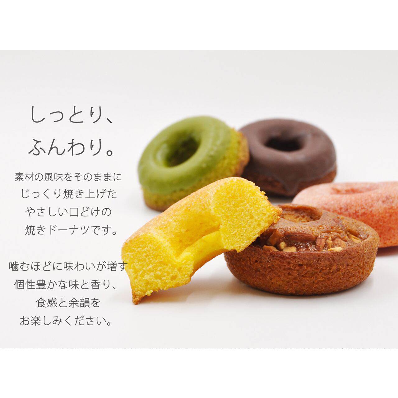味はもちろん、香りや食感の異なる彩り豊かな焼きドーナツは、ご自宅のティータイム、贈答品、お中元やお歳暮など季節のご挨拶品としてもピッタリです。